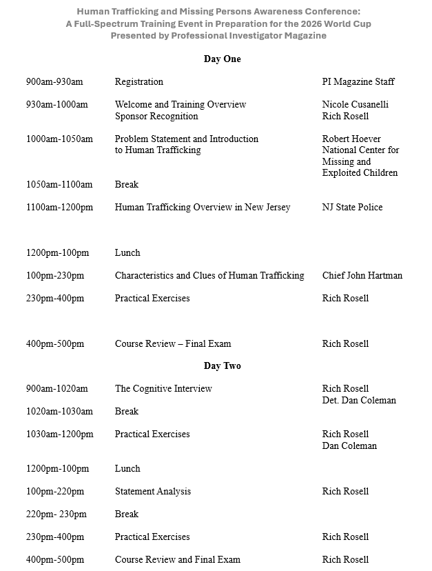 Day One – FREE – Open to private investigators, security officers hotel staff, bar owners, municipal employees, police officers, EMS first responders, firefighters, etc. Training in the techniques of identifying victims of human trafficking in preparation for the World Cup taking place in East Rutherford, New Jersey. All attendees will receive a certification in Identifying Indicators of Human Trafficking upon successful completion of written and practical assessments. (*Open to all – Attendees can attend Day One for Free.)